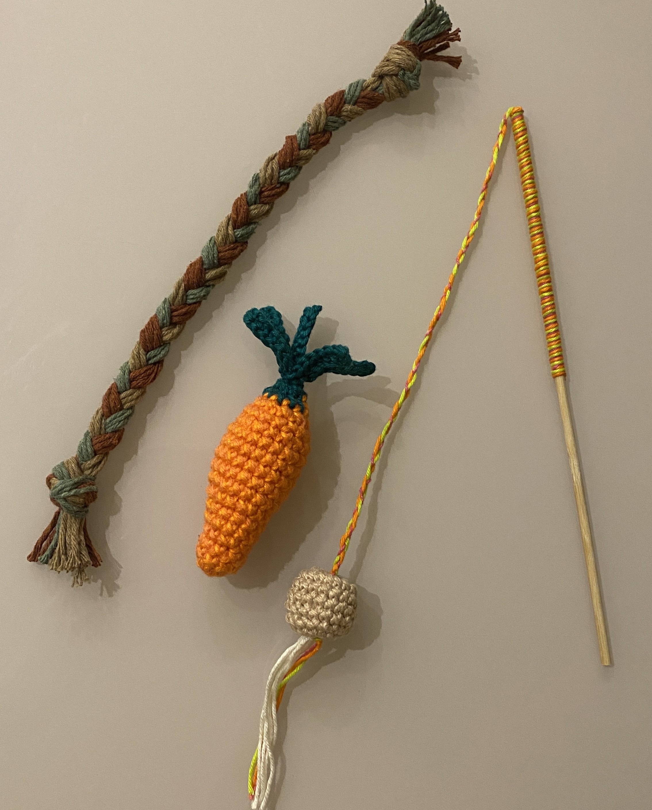 Os brinquedos pet feitos com as sobras de fios ganham um novo destino e são doados para o Projeto Agarra Patas, da protetora Cristiane Romualdo, arrecadar dinheiro para ajudar no cuidado de animais resgatados.